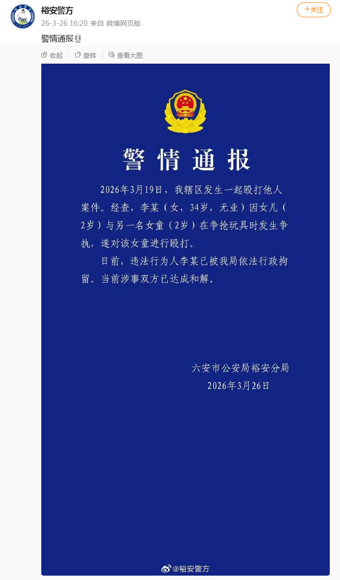 安徽六安警方通报:2岁女童争抢玩具被打,34岁女子被行拘